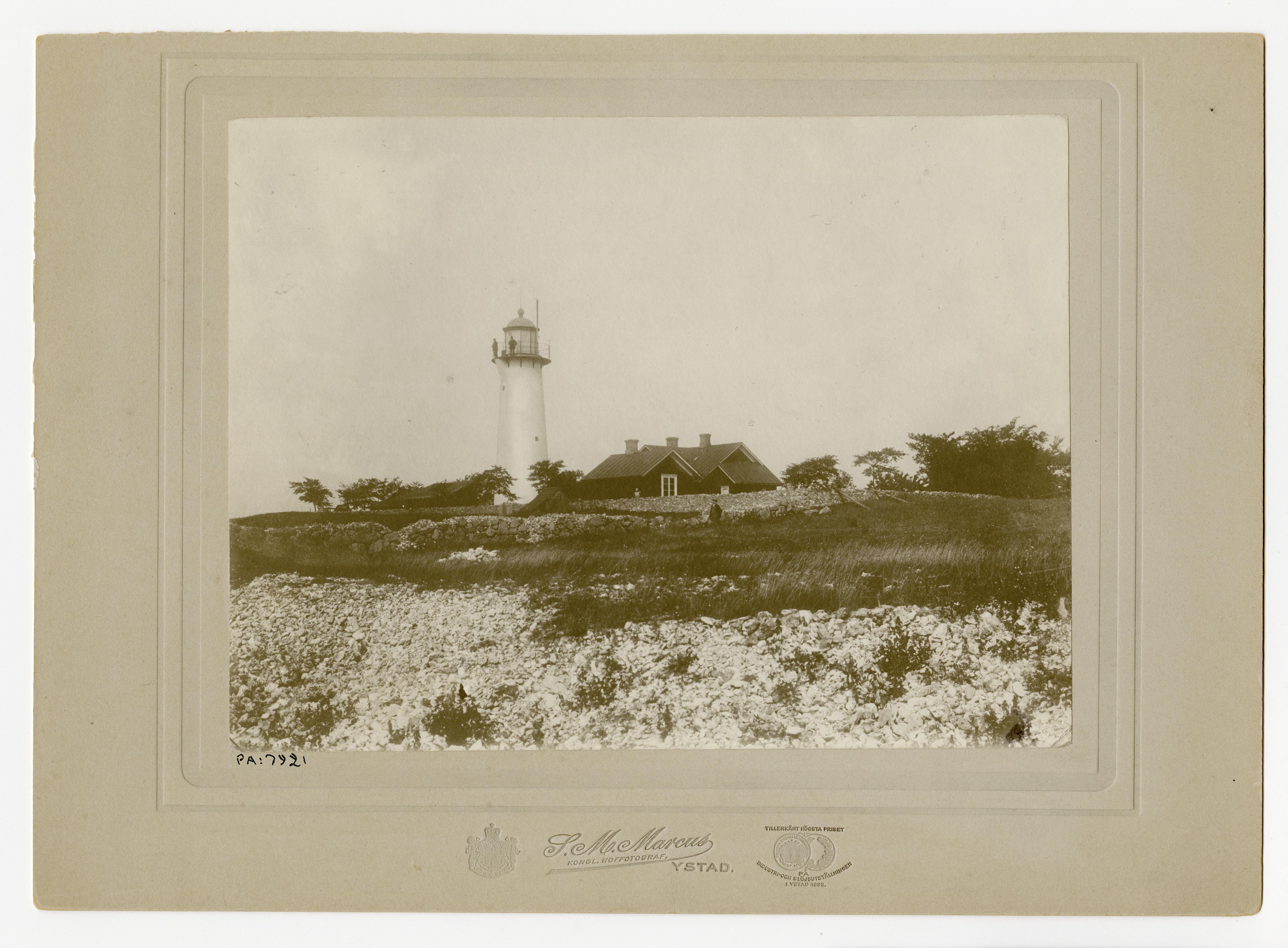 I bilden ser vi en fyr och ett fyrvaktarbostället, obekant plats. I fyrtornet står två personer.