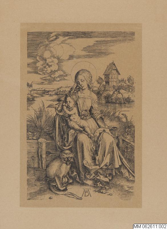 - Bildtryck från ca 1900 i en tysk utgåva på Verlag Fischer & Franke i Berlin. Bilden ingår som blad nr 43 i serien "Hauptblätter graphischer Kunst" och reproducerar Albrecht Dürers kopparstick "Maria mit kind und Meerkatze" från 1497.