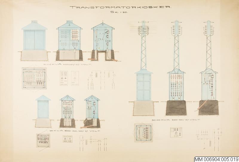Fasad-, sektions- och planritning över transformatorkiosk i tre olika utformningar.