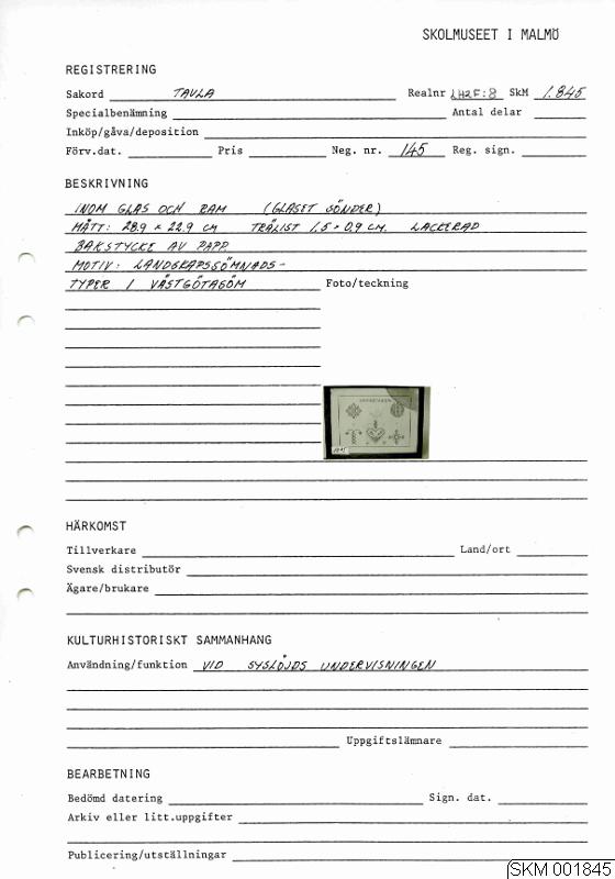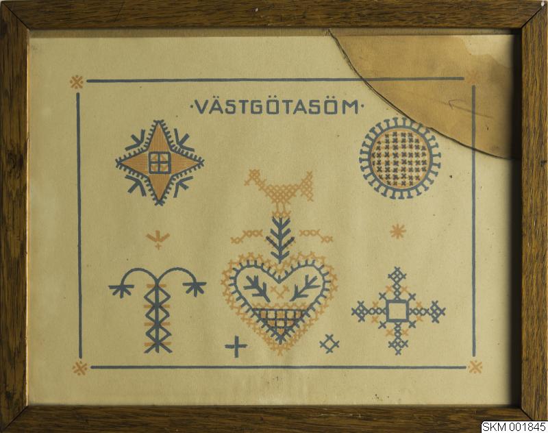 Tavla med landskapssömnadstyper i västgöta söm inom glas och ram (glaset sönder och en del saknas). Nummer 1. Lackerad trälist, bakstycke av papp.