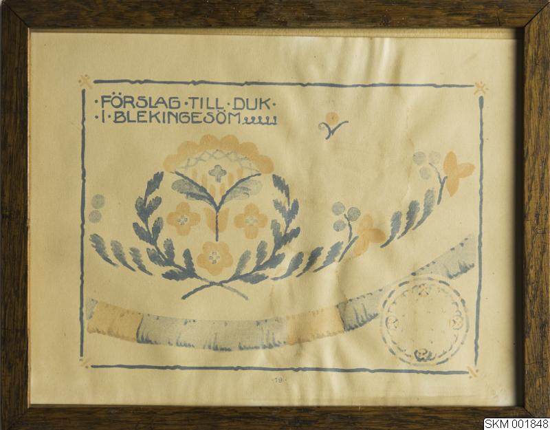Tavla med landskapssömnadstyper. 19 förslag till duk i blekingesöm inom glas och ram (glaset saknas). Lackerad trälist, bakstycke av papp.