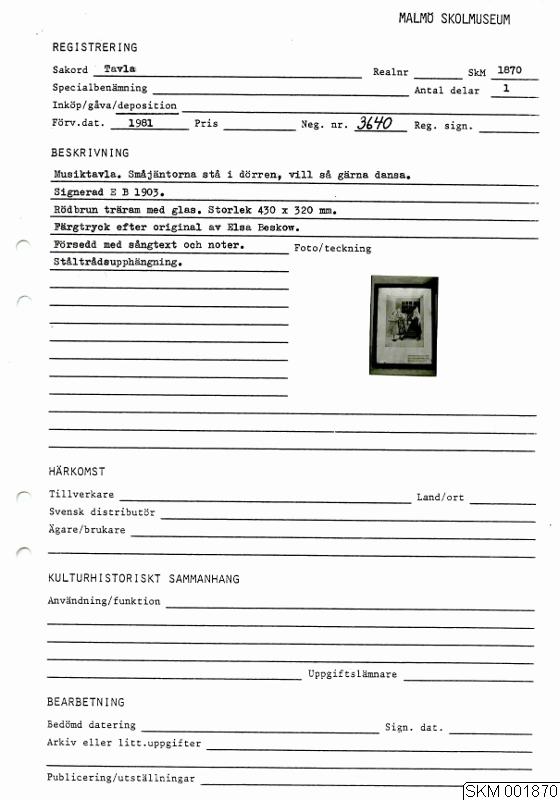 - Musiktavla. "Småjäntorna stå i dörren, vill så gärna dansa". Rödbrun träram med glas. Signerad E B 1903. Märkt på baksidan: Färgtryck efter original av Elsa Beskow. Försedd med sångtext och noter. Ståltrådupphängning.