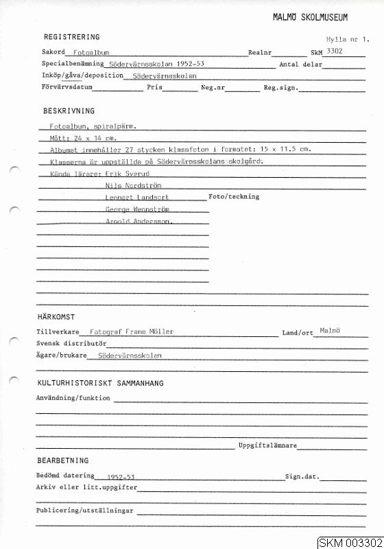 Fotoalbum, spiralpärm. Albumet innehåller 27 stycken klassfoton i formatet:15 x 11.5 cm. Klasserna är uppställda på Södervärnsskolans skolgård.