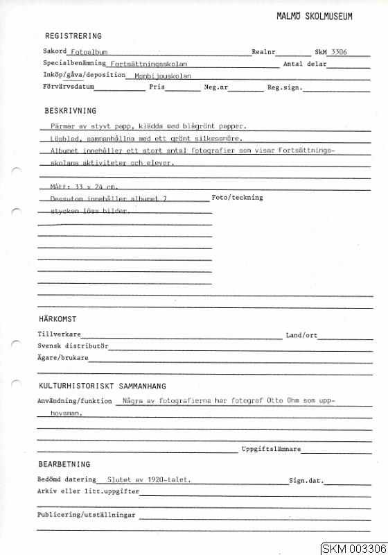 Fotoalbum med pärmar av styvt papp, klädda med blågrönt papper. Lösblad, sammanhållna med ett grönt silkessnöre. Albumet innehåller ett stort antal fotografier som visar Fortsättningsskolans aktiviteter och elever.