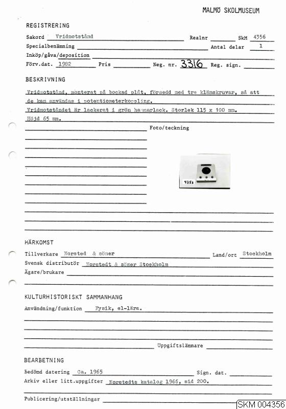 Vridmotstånd, monterat på bockad plåt, försedd med tre klämskruvar, så att de kan användas i potentiometerkoppling. Vridmotståndet är lackerat i grön hammarlack.