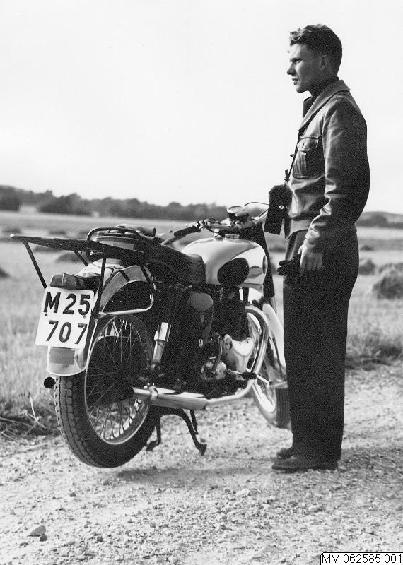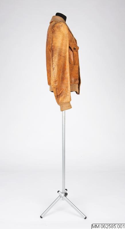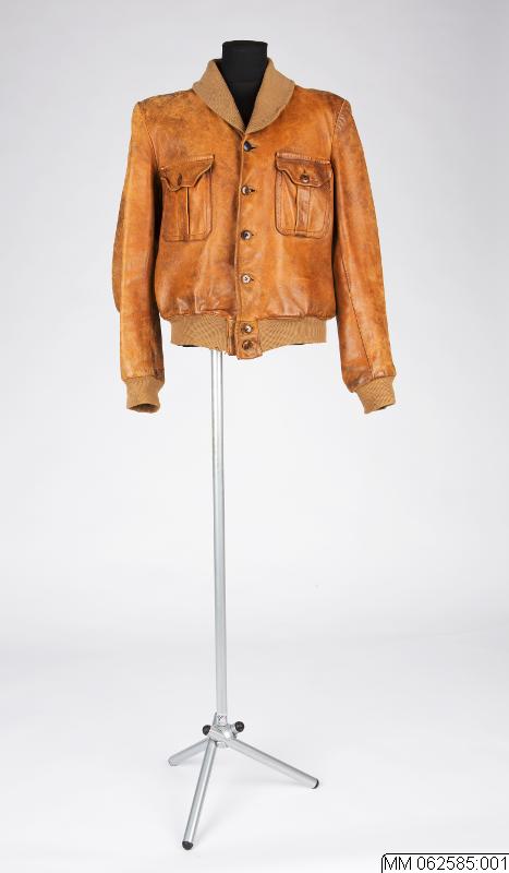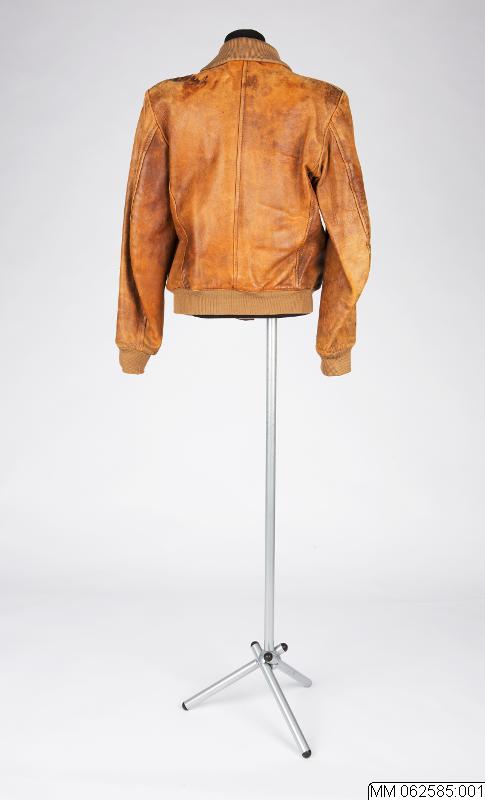 Midjekort skinnjacka med stickad resår i bomull vid ärmarna, kragen och midjan. Knäppning med 6 knappar. Två bälgfickor på bröstet. Fodrad invändigt med tjockt bomullsfoder. Isydd tygetikett: AB inskrivet i ett S.