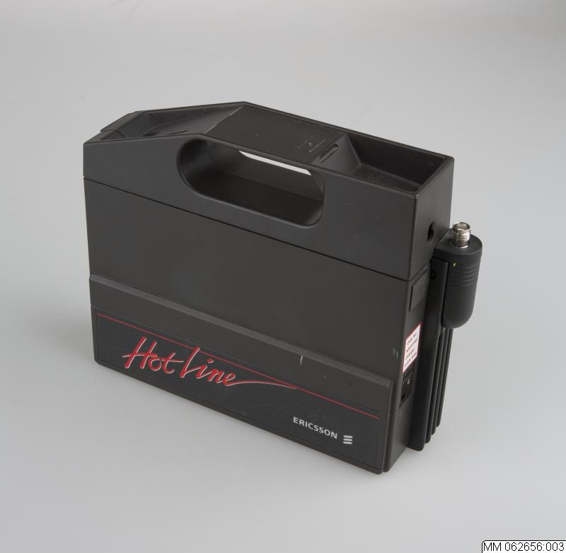 Ericsson Hotline Combi NH450 typ 914 där lur och antenn saknas. Batteriet har typnummer 3501 och serienummer S/N 9230132. Medföljer gör testprotokoll daterat 1989-10-09.