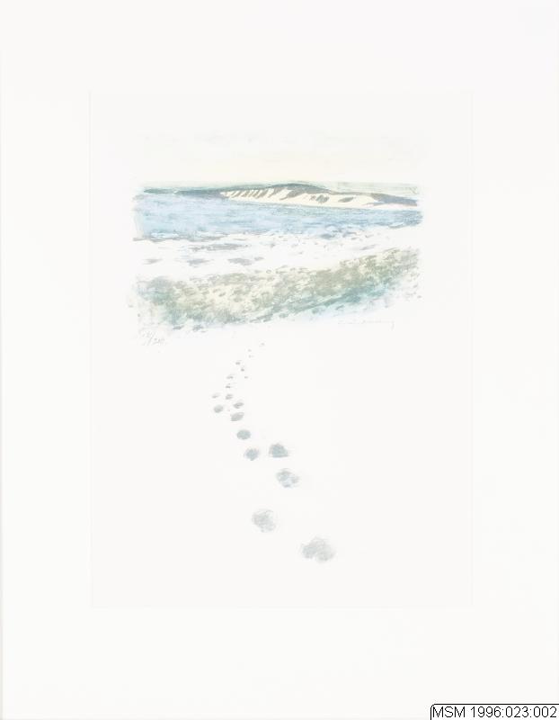 - Bilden visar ett kustlandskap från polarhavet. I den vita nedre halvan av bildytan syns spår i snön av en isbjörn, som leder in i bildrummet där vi ser en skissartat antydd strand, ett öppet hav och en utskjutande landremsa.