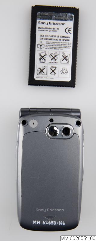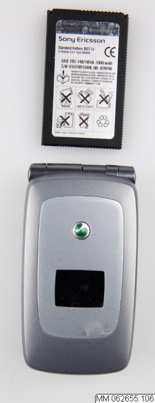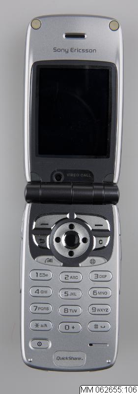 Fällbar mobiltelefon med färgskärm och extern monokrom skärm. Li-Polymer batteri BST-15, made in Japan finished in Sweden. QuickShare står med trycka bokstäver insidans nederdel.
