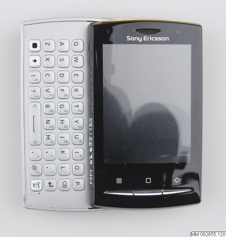 Smartphone med skjutbart QWERTY-tangentbord baserad på Andriod operativsystem. Batteri saknas. På sidan gul klisterlapp med texten 1bjorn-mimmiSP1.
