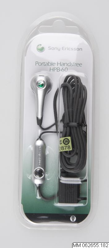 - Handsfree mono hörlurar med systemkontakt i oöppnad förpackning, inplastad och avsedd för upphängning. På förpackningen står bland annat Portable Handsfree HPB-60. For use with: Devices incorporating Fast port D705i, K750, W800.