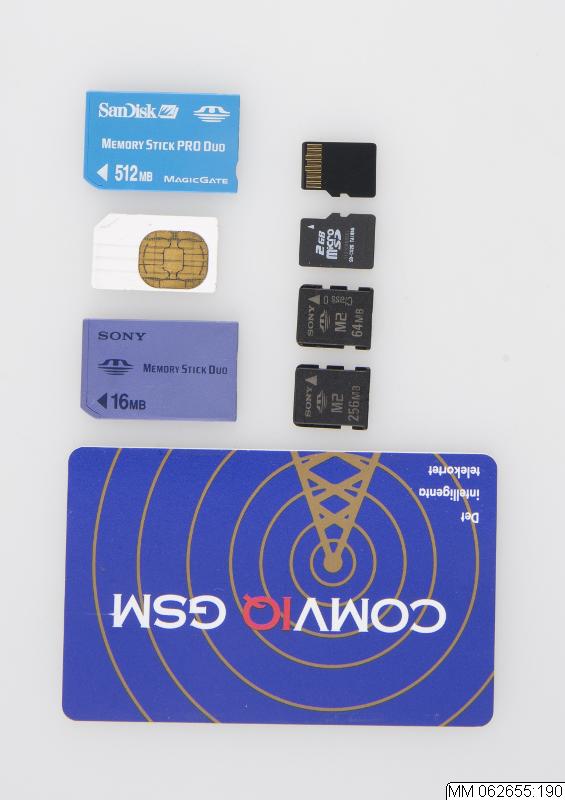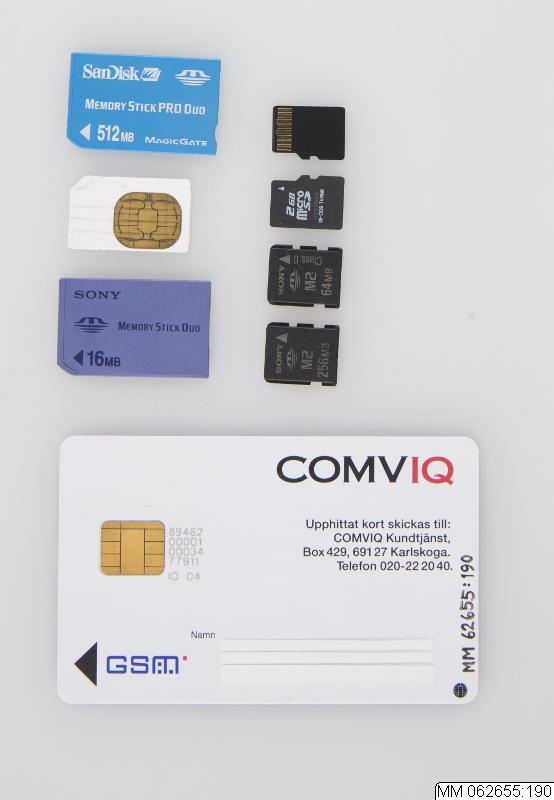 Olika typer av kort använda i mobiltelefoner. Har tagits ur telefoner tillhörande samling MM 62655. Består av följande: