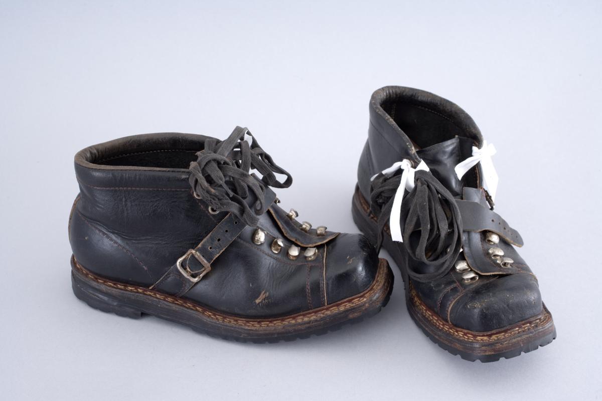 Pjäxor, med vristrem och spänne i vitmetall. 4 par hakar av metall och 2 par snörhåk för snörning. Svarat pjäxsnören.