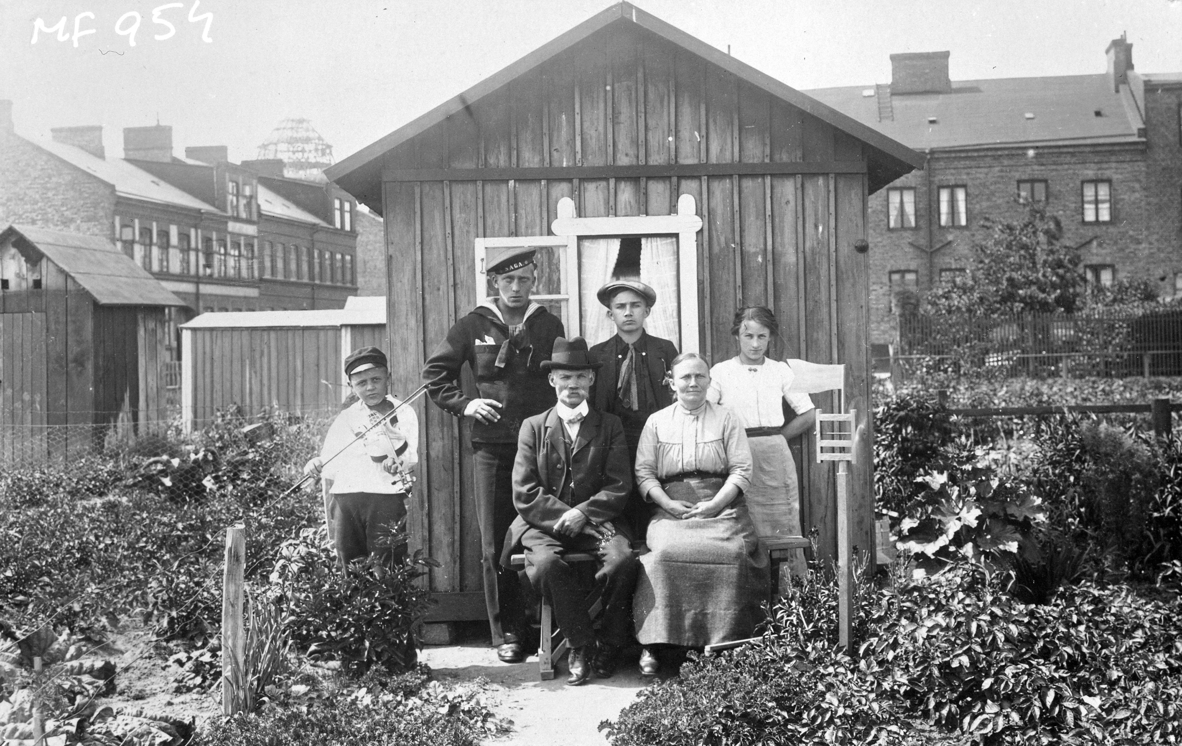 Gruppbild vid en kolonistuga, en pojke med en fiol och en sjöman.