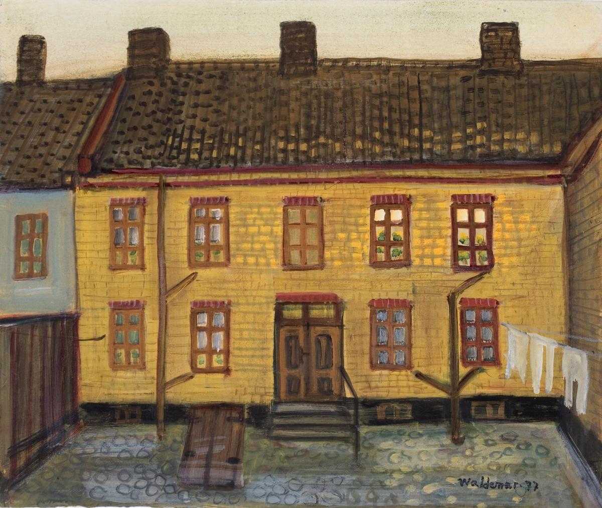 Gårdsinteriör. Från vänster till höger i målningen sträcker sig ett gult hus i två våningar. Huset är i klargult tegel, bruna fönsterbågar och brunt tak. Mitt fram ytterdörr med trappa.Till vänster i marknivå finns en källarnedgång; träluckor.