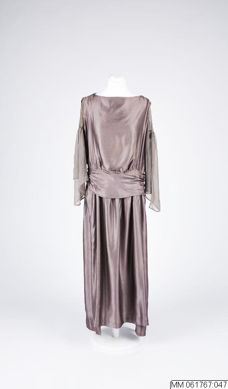 - Klänning med avskuren midja på höften. Rak nederdel med isydda tyngder i varje sida. Rund halsringning, knäppning i midjan med tryckknappar. Påsydda vida ärmar av chiffong som avslutas i en flik i nederdelen. På sytt brett skärp i midjan. Stora maskinbroderade ? blommor i silkegarn på livets framsida och kjolens nedre del.