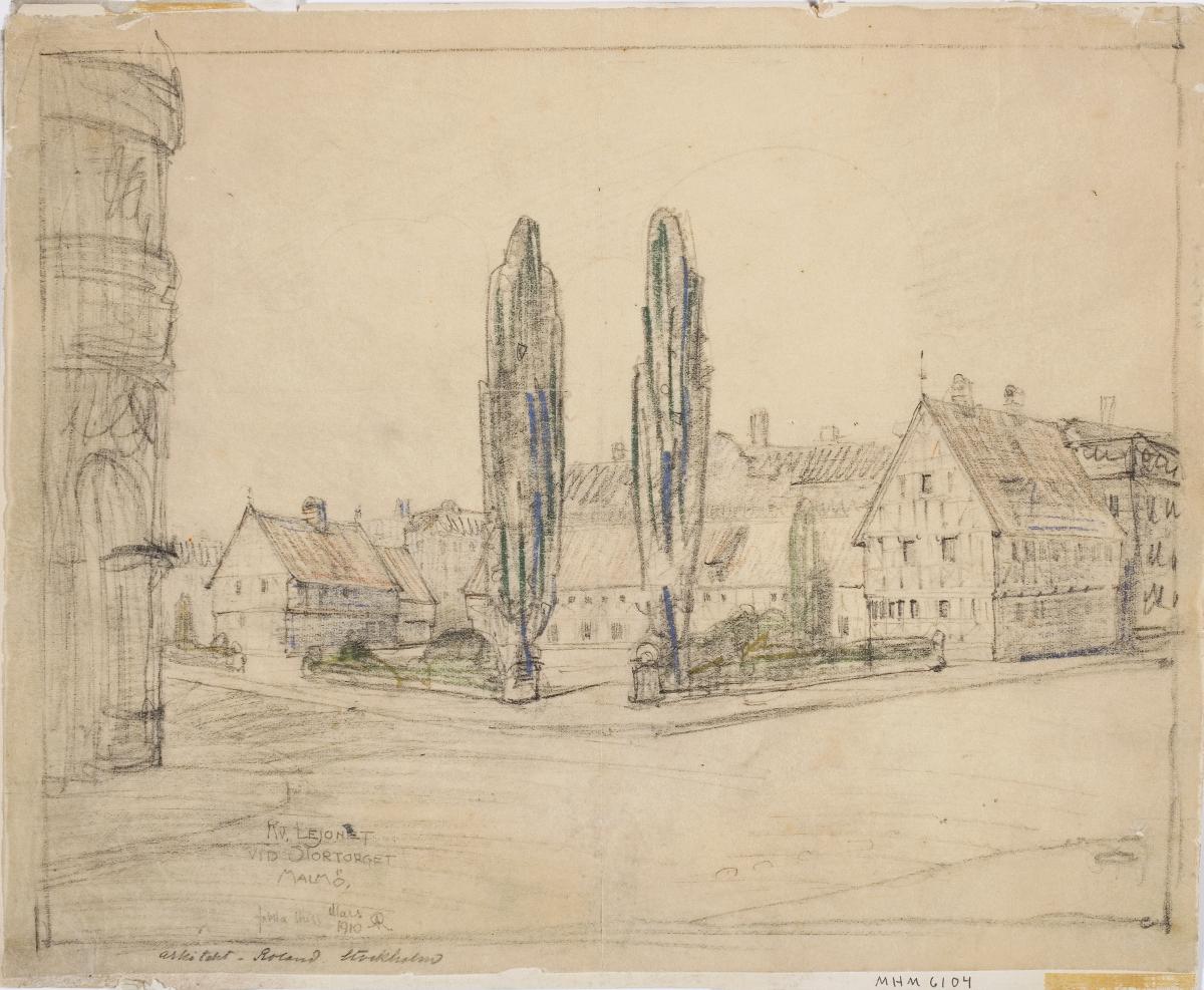 Kv. Lejonet sett från sydväst. I bildens mitt det sydöstra hörnet med två popplar, till höger Gamla Apoteket Lejonet, i mitten dess länga utmed Isak Slaktaregatan, till vänster korsvirkeshusen vid Mäster Johansgatan, i kvarterets mitt en öppen gård. I bildens vänstra kant hörnet av ett höghus.