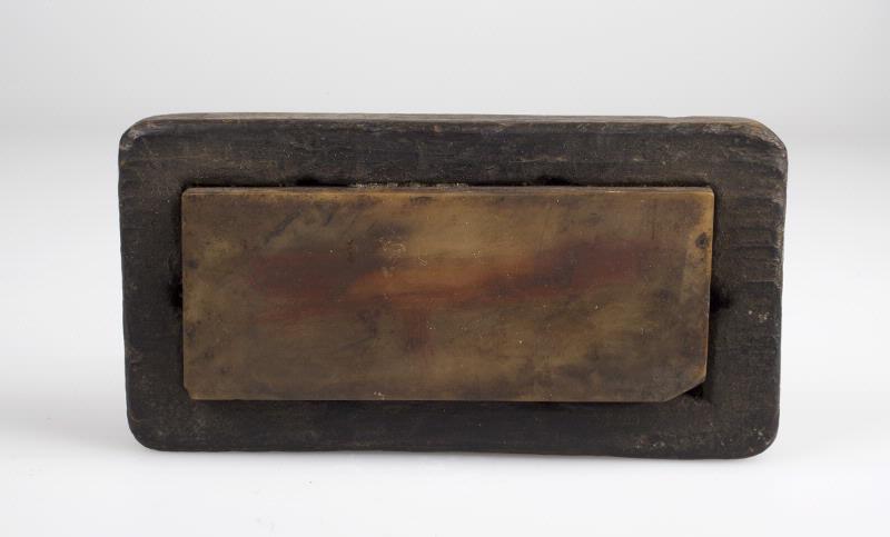 Träplattan mörkbrun (omålad), stenen grågul med ett stråk rödaktig färgning mitt på. Stenens ena hörn är snett avskuret.