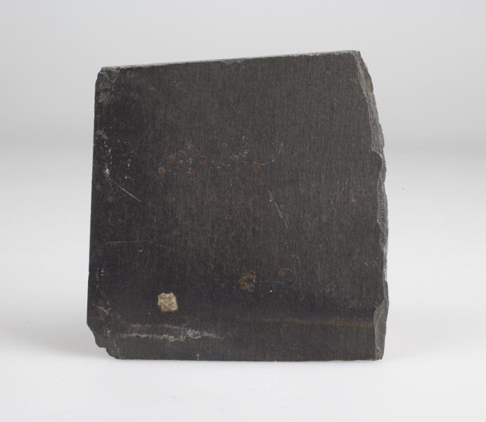 Skifferplattan är av svart lerskiffer, ej helt kvadratisk, två motstående sifor slätt skurna, de övriga två brutna, den ena med rak den andra med ojämn kant.