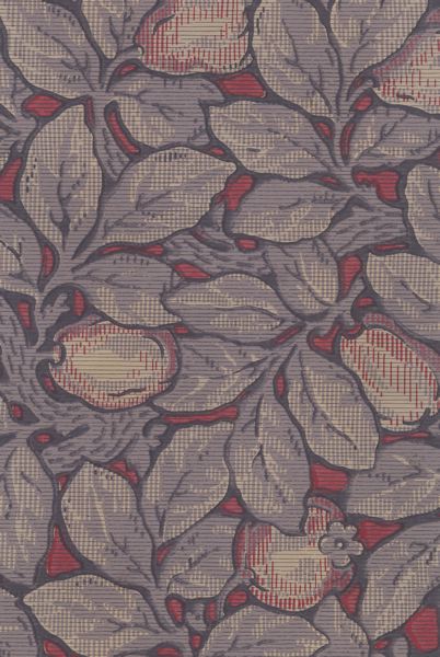 - Tapeten är stormönstrad i en mild blå-grå-lila färgskala med mönster av blad och frukter. Bottenpappen är ljust gråbeige. Rullarna är stämplade med en oval, lila stämpel med texten: NORRKÖPINGS TAPETFABRIK NORRKÖPING No 34566. Ytterligare en stämpel har texten: Arsenikfri Kontrolerad av Norrköpingsstads kemiska undersökningsanstalt.