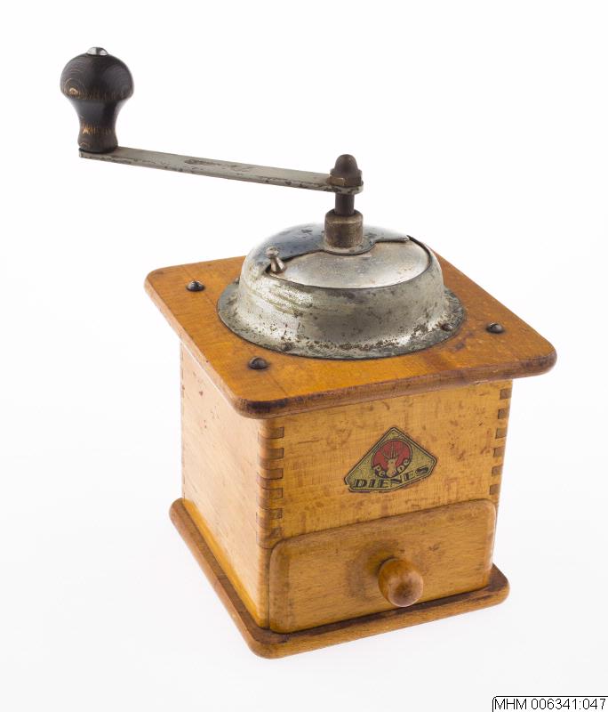 Kvadratisk kaffekvarn med låda och vev. Lådan har oval träknopp. Rund malanordning av metall på vilken sitter en rak metallvev med svarvad träknopp.