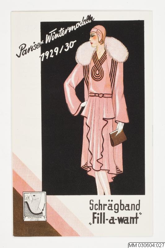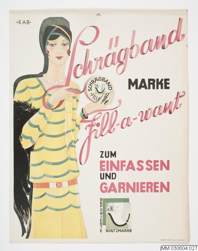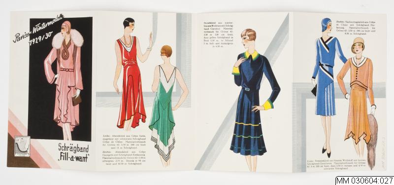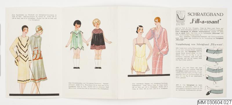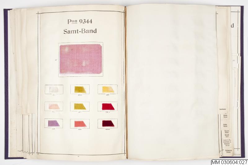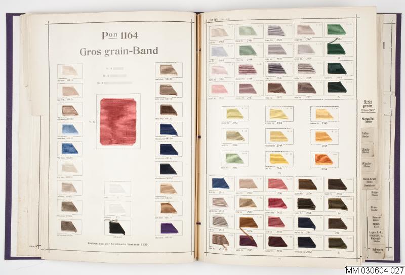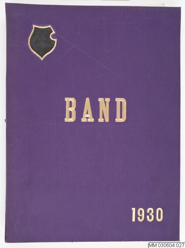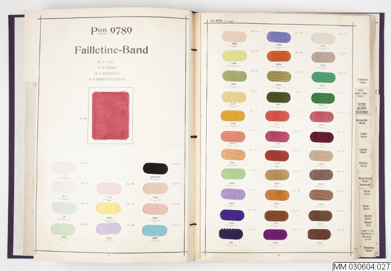 - Lila bok full med olika bandprover. På utsidan finns en text i guld; BAND 1930, samt en svart sköld med guldkontur. Boken börjar med en prislista med alla band och deras olika bredder, priserna gäller per 10 meter och betalas i guldmark. Därefter följer en mycket stor mängd band i himmelens alla färger, så gott som alla enfärgade, olika tekniker, bredder och kombinationer sorterade i områden efter ett fliksystem i högerkanten.