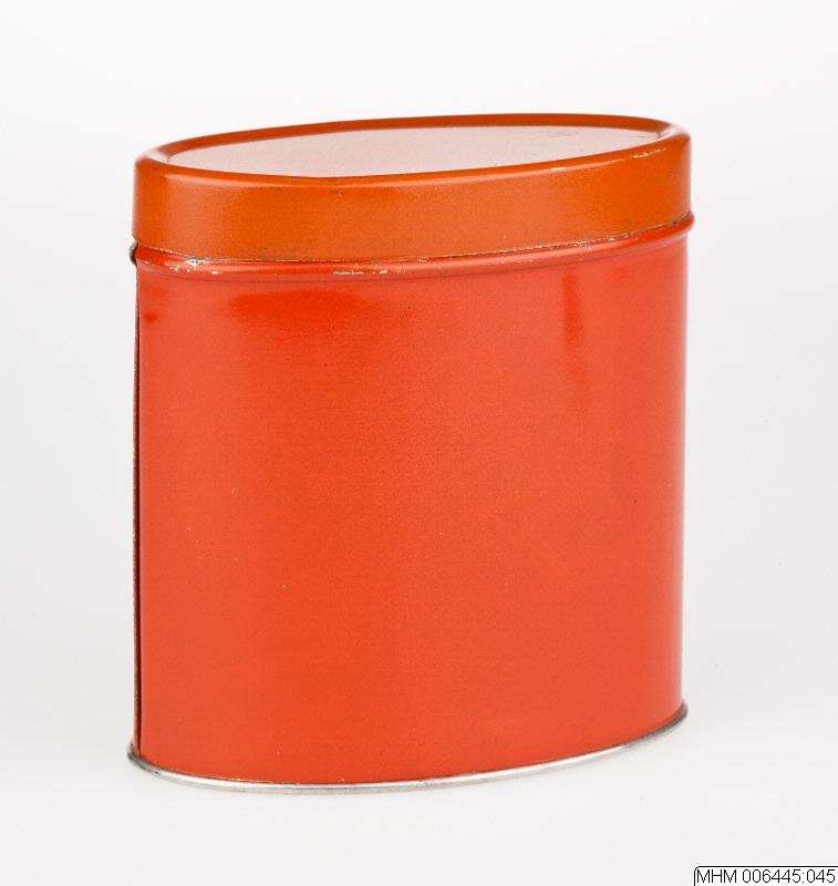 Burken är oval med platt lock. Flat botten, raka sidor. Är lackerad med orange färg.