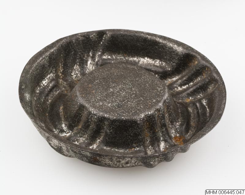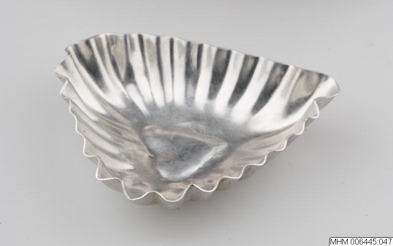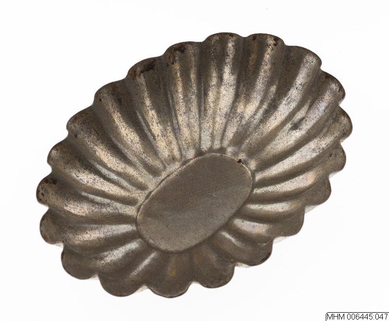 Oval, slät botten, utåt veckade sidor; l 8,5 cm, b 6 cm, h 2 cm.