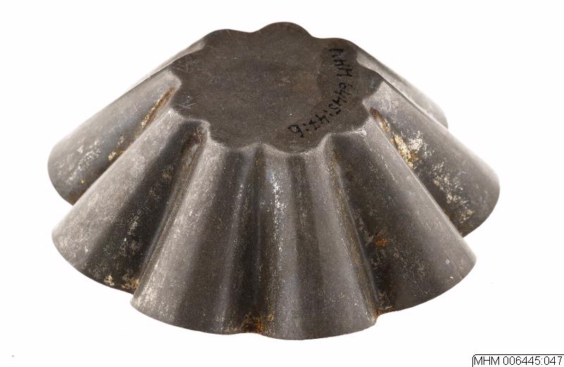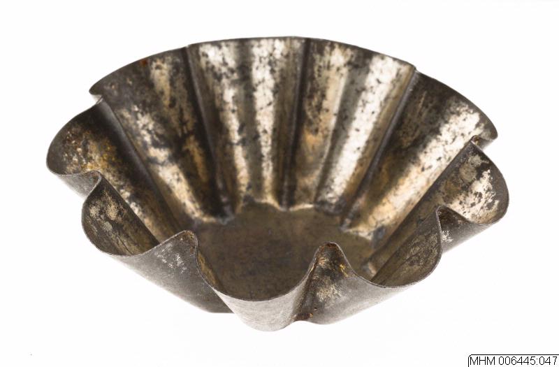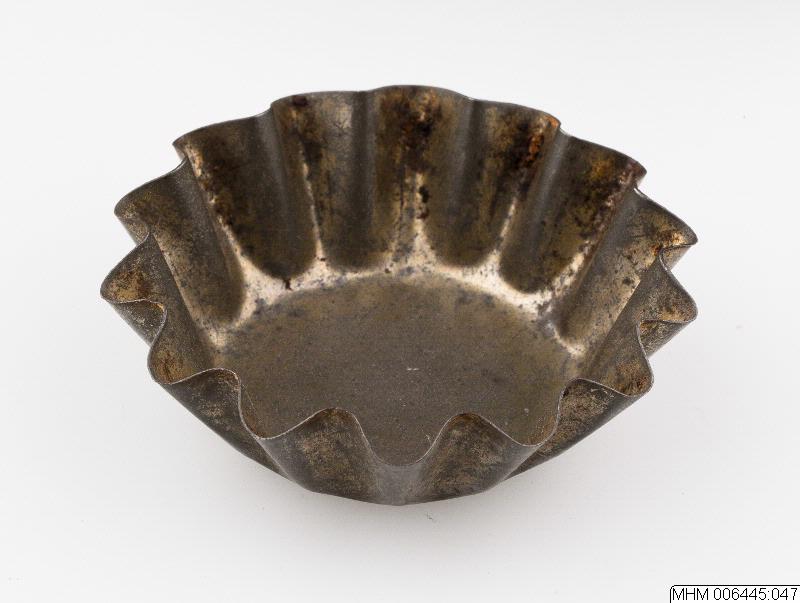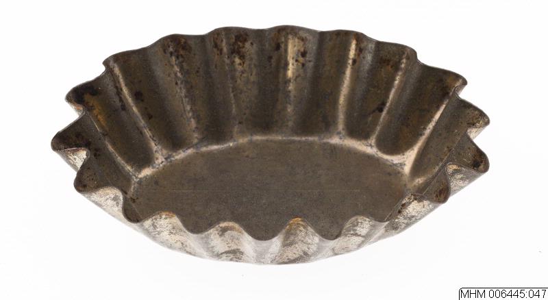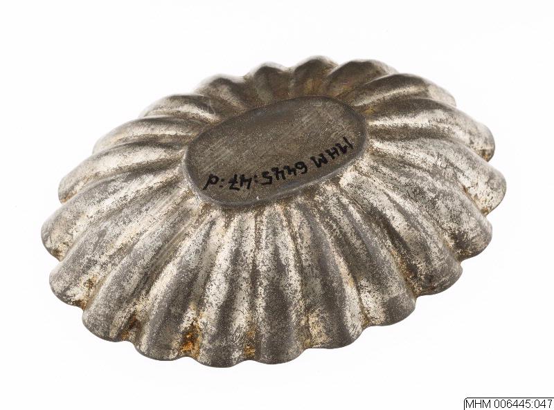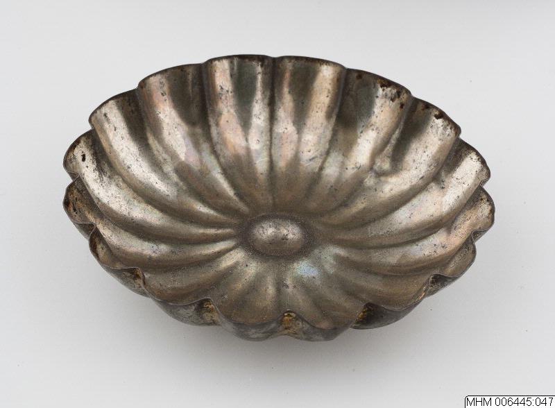 Rund,slät botten, utåt veckade sidor; d 6,5 cm, h 2 cm.