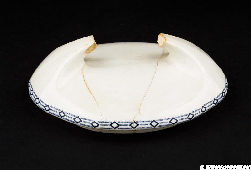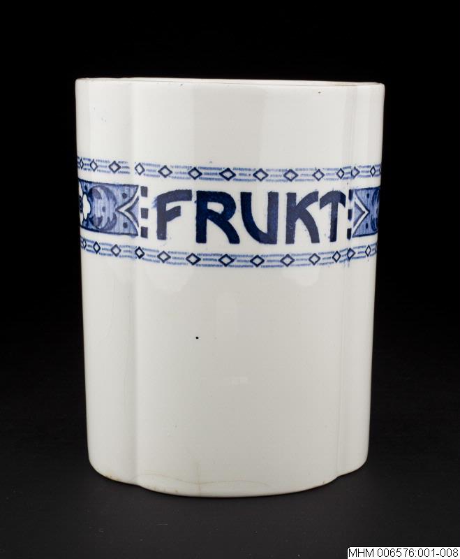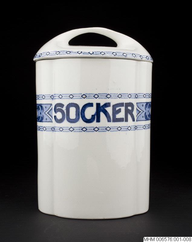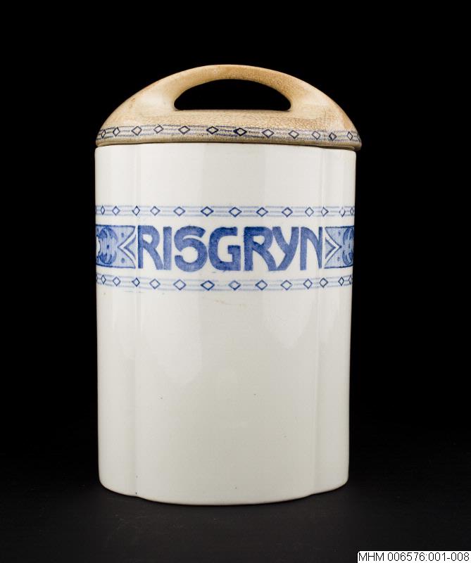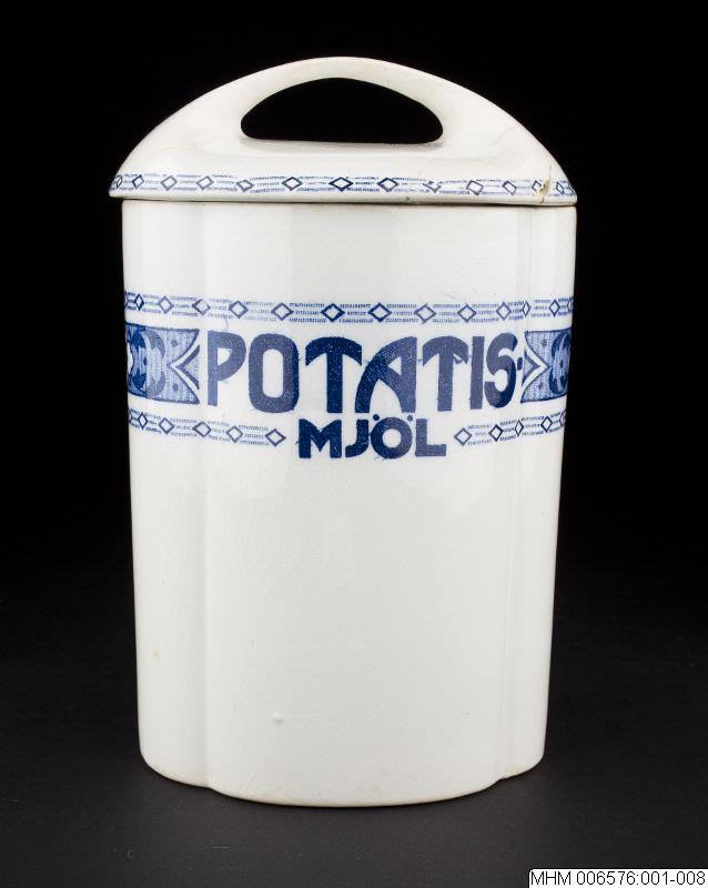 Fyra stycken burkar med lock av vitt porslin med blått mönster och text Frukt, Potatismjöl, Socker och Risgryn.