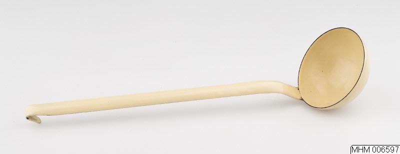 Slev av gul emalj med slätt skaft som avslutas i en hängkrok. Konisk