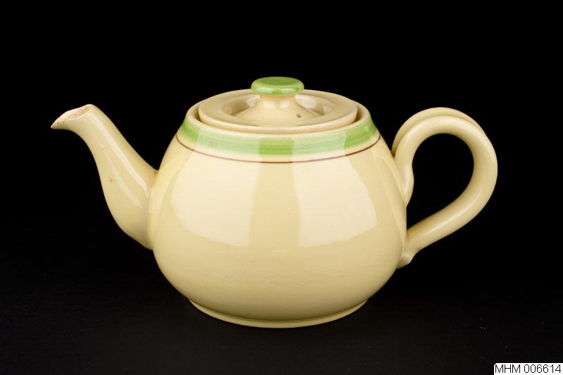 Tekanna med cylindrisk, bukig kropp. Runt mynningskanten en grön rand