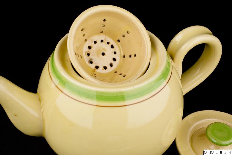 insats av porslin för teblad. Runt lock med grön knopp.