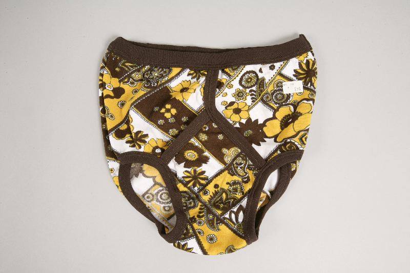 Kalsonger i mönstrad bomullstrikå. Gylf med Y-front med kantning av brun trikå. Brun linning med resårband. Benöppningarna kantade med brun trikå. Påsydd etikett i innersöm, märkt: 7