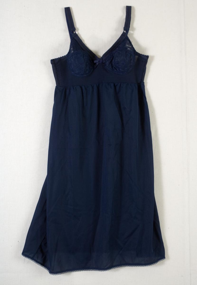 Mörkblå underklänning i 2 våder med påsydd BH-del i stretchresår. Kupor i genombruten spetsBH-kupor och reglerbara axelband i resår.Nederdelen kantad av smal spets. Sekundärt insydd i sidorna.