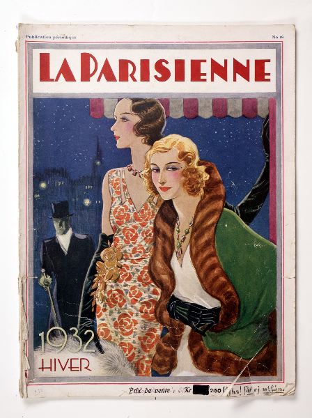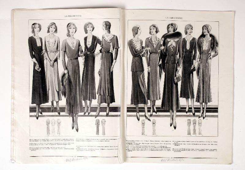 - Fransk modetidning, La Parisienne, nr 18 - vintern 1932. Omslaget visar två tecknade kvinnor i färg. Tidningen inleds med ett oppslag med text på franska och tyska, därefter följer tre och ett halft uppslag med teckningar på klänningar i färg. Sedan övergår tidningen till att bli svart-vit. Varje modell beskrivs kortfattat nertill på sidan på både franska och tyska. Tidningen har 40 sidor.