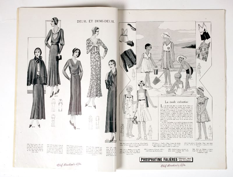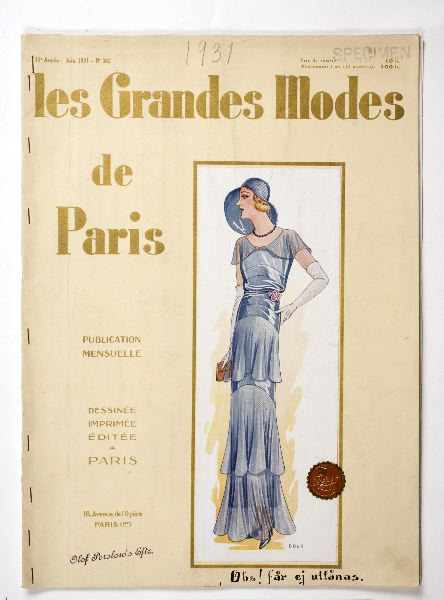 - Fransk modetidning, Les Grandes Modes de Paris, No 358 och No 362 från 1931. Tidningarna är något olika, No 358 är något mindre i formatet och är inte lika omfångsrik. Sidorna fylls med tecknade modeller i svart-vitt och No 362 har dessutom flera färgplanscher.
