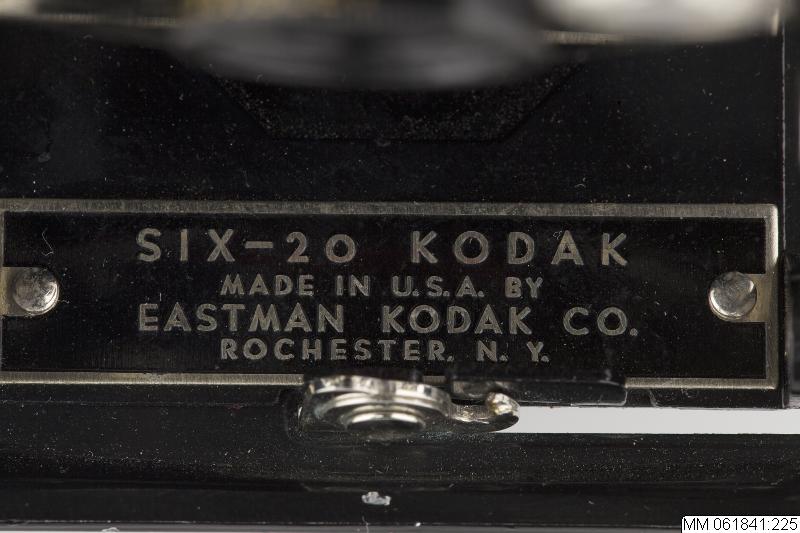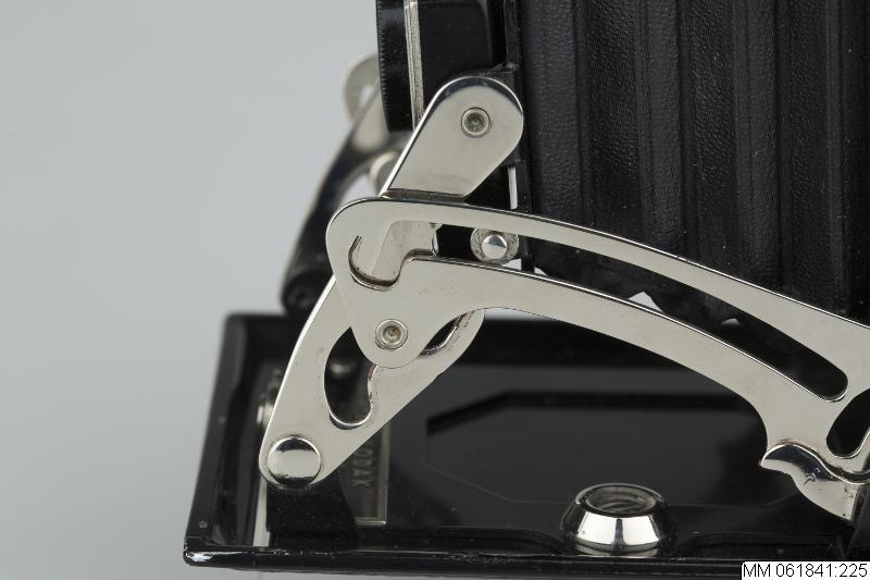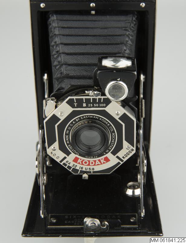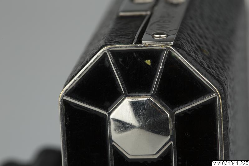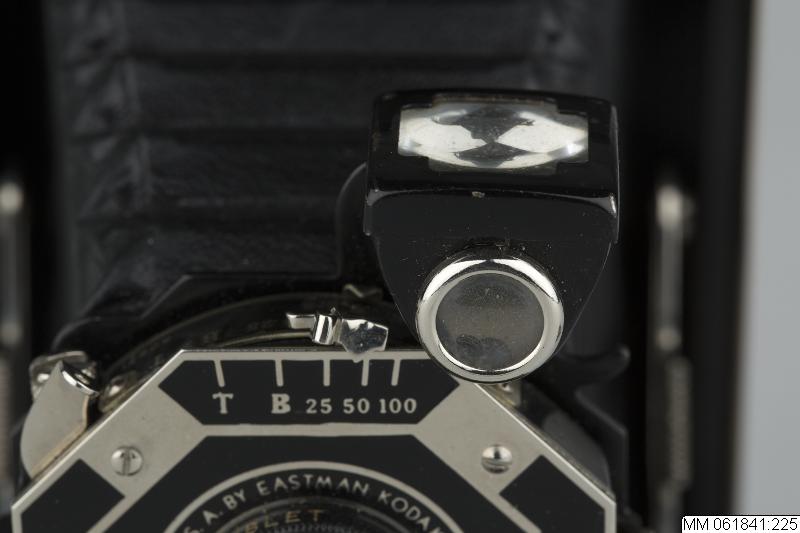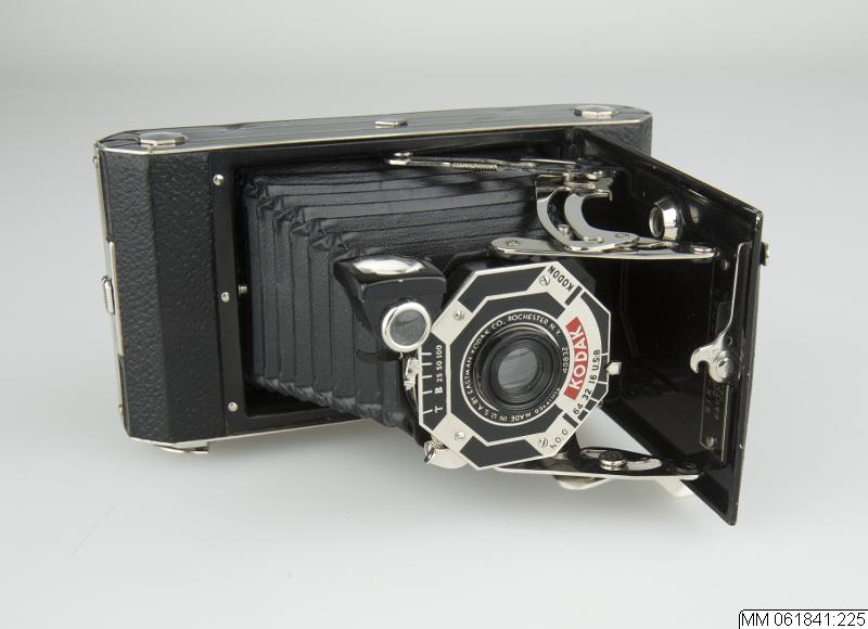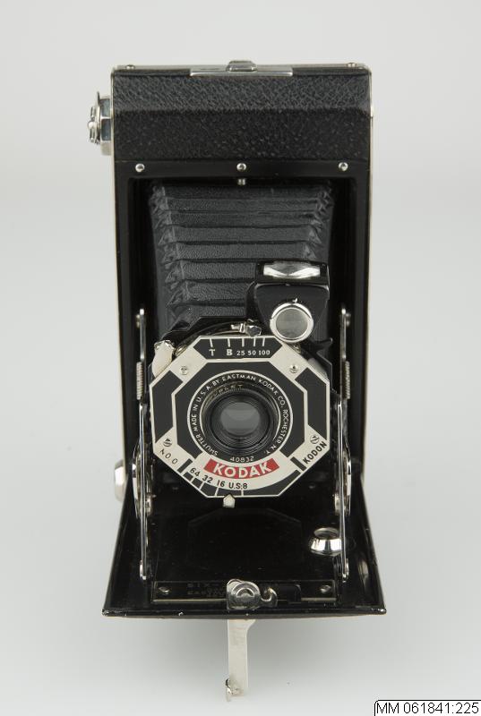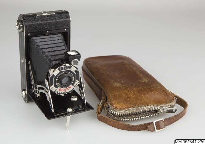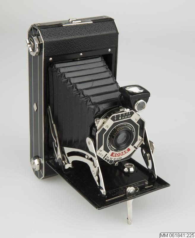 Bälgkamera för 620 rullfilm i Art Deco stil. Medföljer kamerafodral i brunt läder.