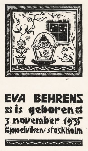 Svart tryck på vitt papper. Motiv: vagga med blomstermålning, urna med blommande växt, fönster med stjärnbeströdd himmel utanför. Motivet omges av en ram.