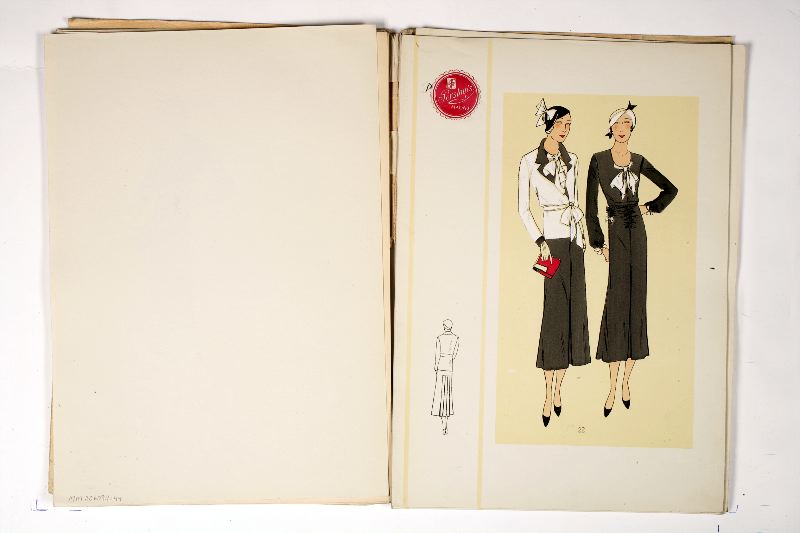 - Två mappar med tecknade modebilder, troligen franska, med namnet St & Co, från 1930-talet. Försättsbladen är beiga, sommarkatalogen, Printemps-Eté, med ett brett rött fält på längden och vinterkatalogen, Hiver 1932, med ett smalt rött och ett smalt blått streck tvärsöver. Innuti mappen ligger lösa blad med tryckta modeteckningar. En modell per sida visas framifrån och bakifrån. Sommarkatalogen innehåller 35 blad och vinterkatalogen 42 blad.
