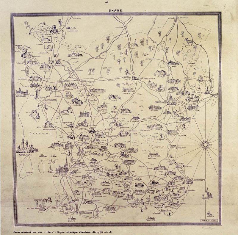 Karta över Skåne med järnvägsnätet utritat. Ett flertal kyrkor, slott och herrgårdar är tecknade tredimensionellt.