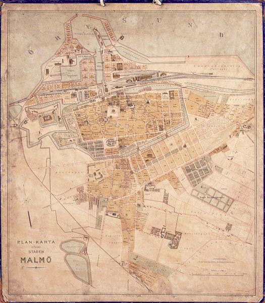 Karta uppklistrad på kartong, visar staden Malmö 1890