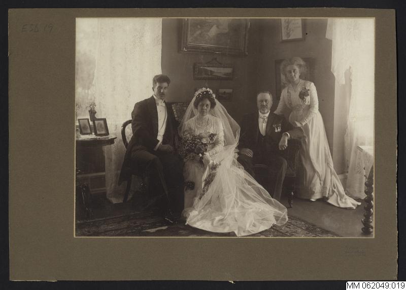 Brudpar - Per Edmund Skoglund och Sarah Helena Ramsten och vittnen C.M. Ramsten (brudens far) och Annie Ramsten (brudens syster). Bilden tagen i hem - Fridhemsvägen 8. 5 oktober 1911.