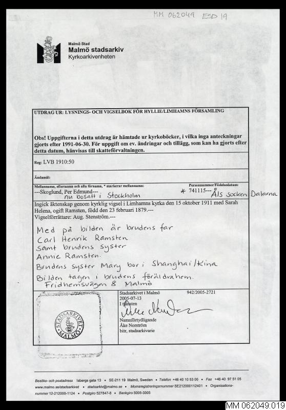 Sarah Helena Ramsten f. 23.2.1879 i Malmö Caroli församling d. 30.1.1963 Högalids församling Stockholm min farmor.