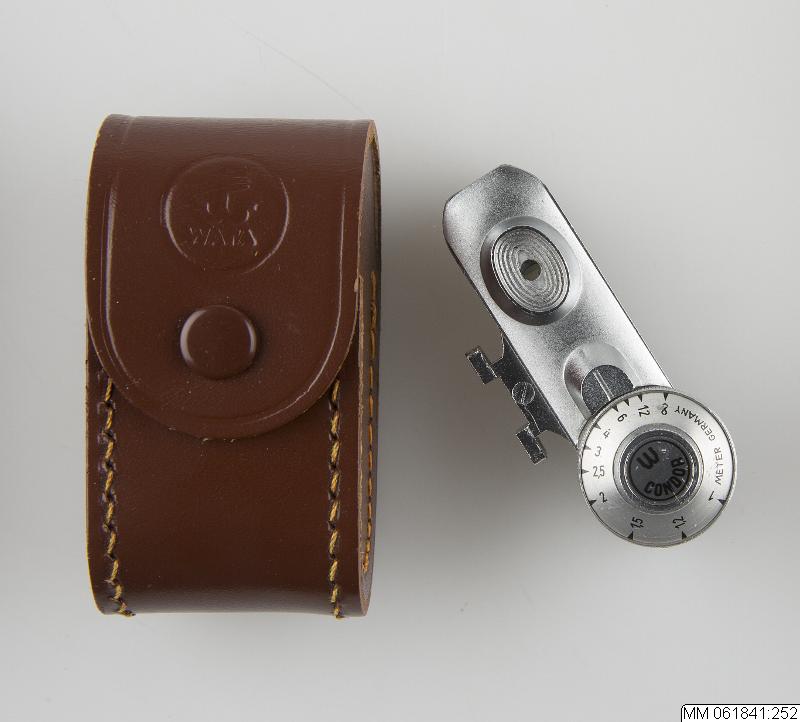 Två avståndsmätare varav en i läderväska. Tillbehör till kamera för standard tillbehörsfäste. På läderväskan står Wata och West Germany.