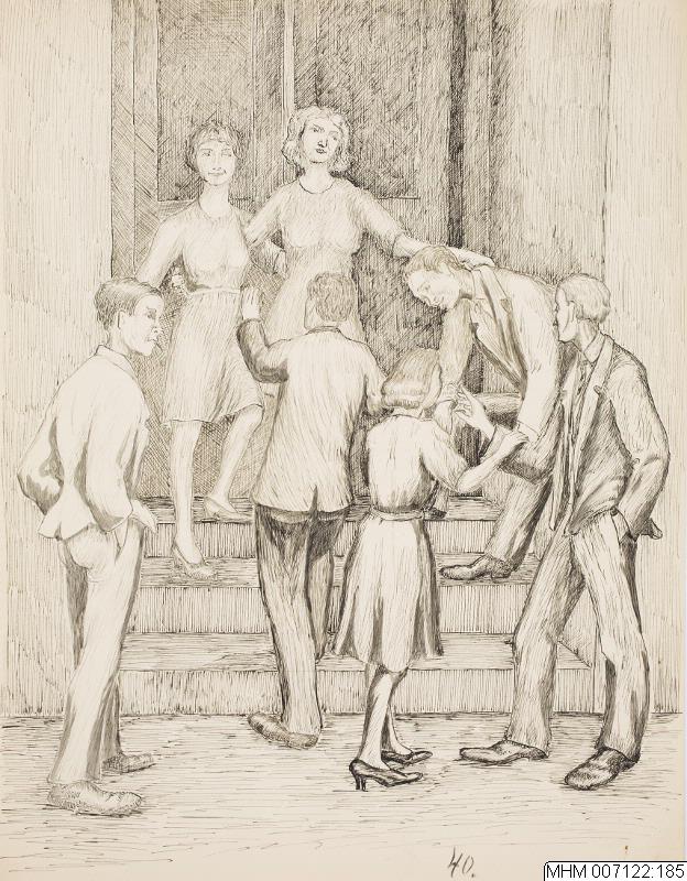 - Bilden visar en grupp ungdomar vid en trappa. Vi ser tre flickor och fyra pojkar stående intill och på en kort trappa med tre trappsteg som leder upp till en dubbeldörr. Kanske är det skolungdom på rast? Några av ungdomarna gestikulerar med händerna och verkar indragna i en livlig diskussion, medan andra lyssnar eller tittar bort. Samtliga pojkar är klädda i kavaj och byxor medan flickorna bär klänning. Trappan och huset ligger parallellt med bildplanet och är så snävt beskuren att inget mer berättas om omgivningen.
