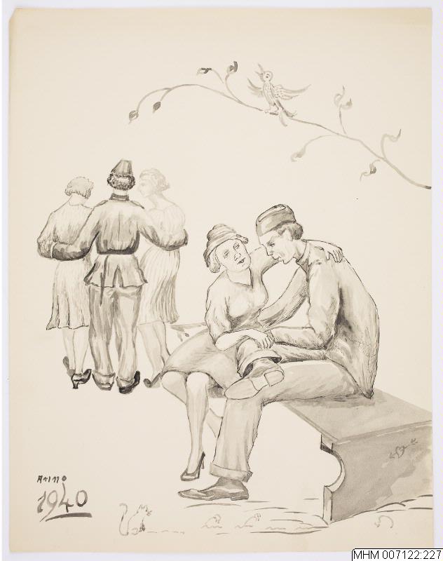 - Vi ser två värnpliktiga soldater i uniform tillsammans med tre flickor. T.h. i förgrunden ser vi en soldat och en flicka sitta på en bänk som sträcker sig i snett perspektiv in i bildrummet. Mannen sitter något framåtböjd och med ena benet över det andra. Flickan bredvid har lagt ena handen på hans ben och andra över hans skuldra. T.v. i bakgrunden ser vi den andre soldaten stående bakifrån. Han har en flicka på varje sida och har lagt sina armar om deras midjor. En tanig trädkvist skjuter in från höger bildkant ovanför bänken. En ensam fågel sitter på kvisten, fladdrar med vingarna och sjunger sin sång. Längs nedre bildkant finns lite klotter i form av en katt, två småfåglar, ett hjärta genomborrat av en pil.