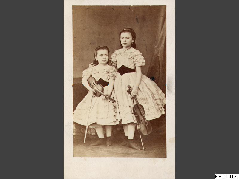 Visitkortsfotografi. Porträtt av de violinspelande systrarna Julie och Juliette De la Pierre.