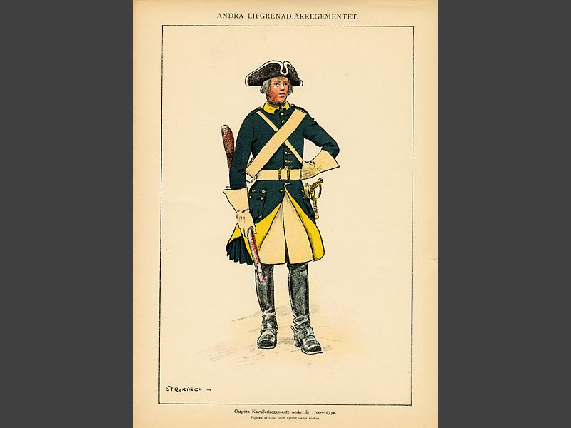 - Tryck av uniformsteckning på vit kartong. Motiv och text: Andra Livgrenadjärregementet / Östgöta Kavalleriregemente omkr. år 1700-1731 / Figuren afbildad med kyllret under rocken.