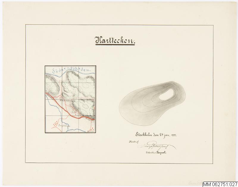 - Ritning/illustration av karttecken för höjdkurvor mm. Två illustrationer varav den vänstra är en genomförd kartbild med många tecken, medan den högra visar enbart höjdkurvor. Elevarbete utfört av Helge Petersson under sin utbildning på underofficersskolan i Stockholm 1896-97.